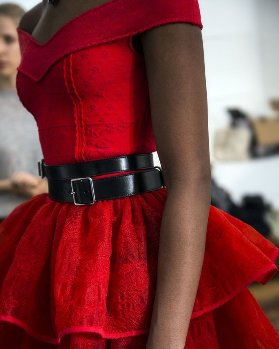 - Off-the-shoulder lust red rose jacquard bustier dress worn with a silver hardware double straight belt. From the Autumn/Winter 2019 pre-collection: http://bit.ly/mcqueen_preaw19 #McQueenPreAW19 #AlexanderMcQueen