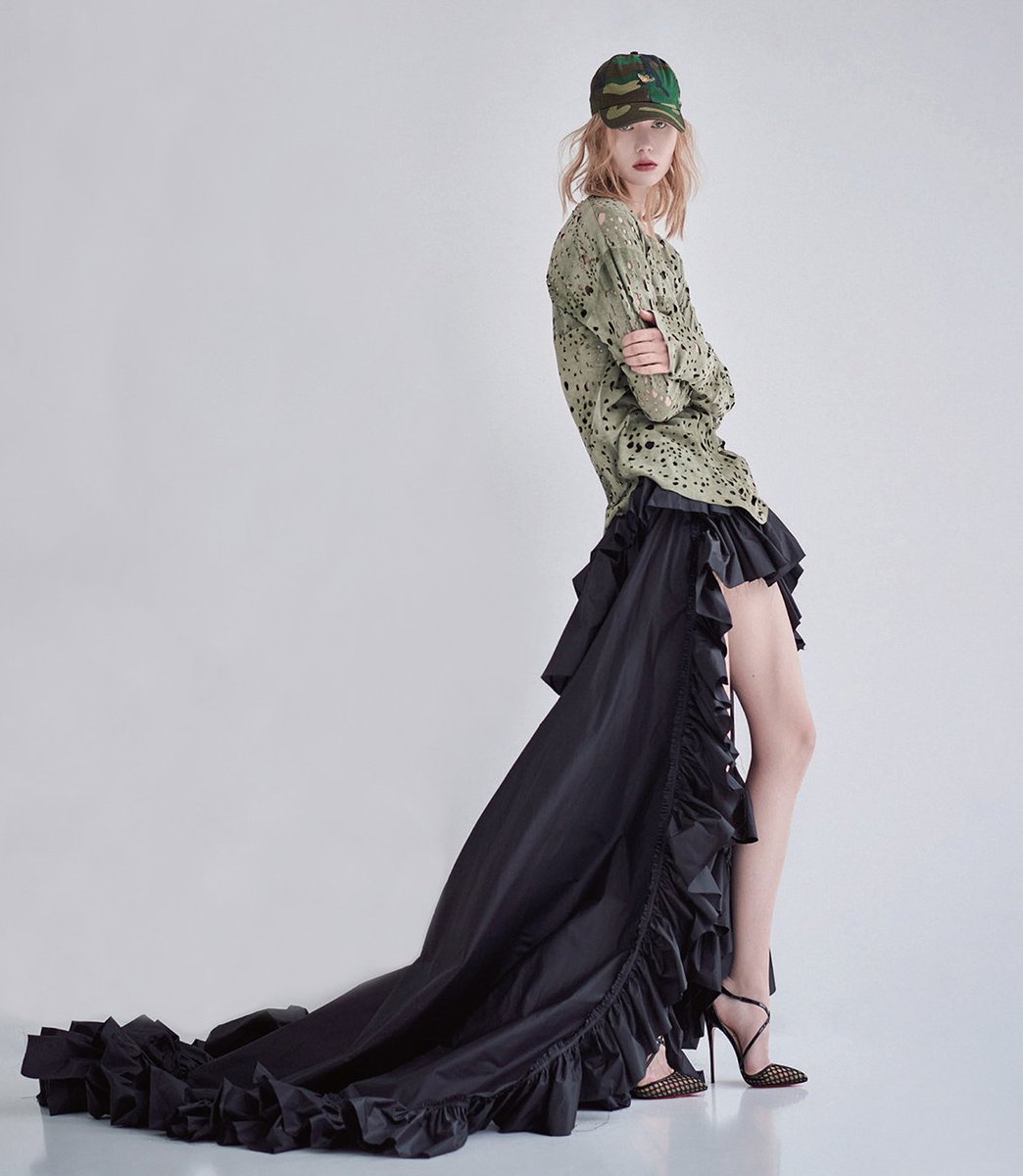 - A #RobertoCavalliSS16 silk taffeta black train skirt matched with a perforated suede top featured in @NumeroTOKYO.