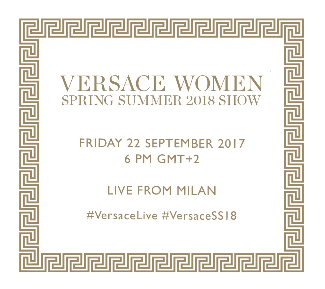 - Join us on the runway. Watch the #VersaceSS18 Women's Fashion Show live on http://Versace.com 22.09.17 6PM (GMT+2) #VersaceLive #MFW