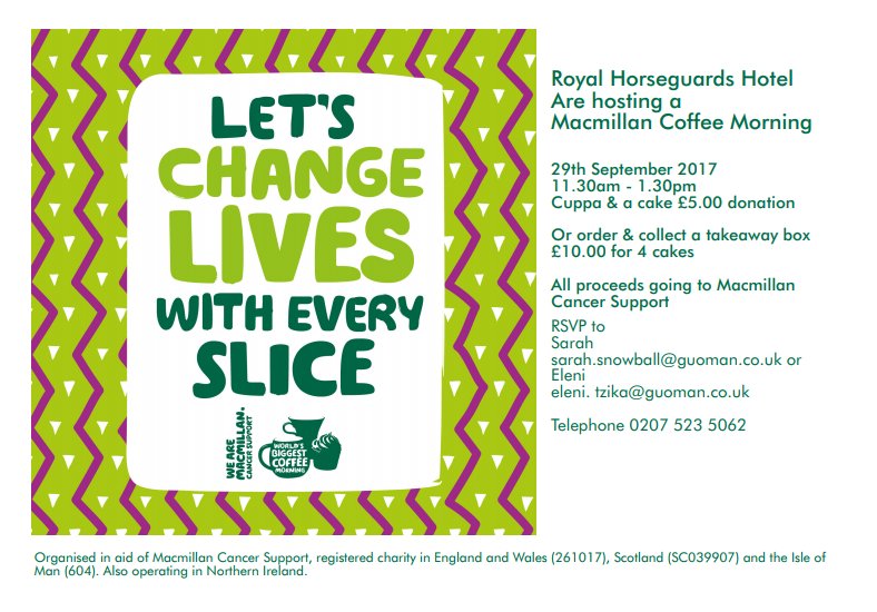 - We're overjoyed to welcome @HowardMiddlebun & the @macmillancancer team to our #CoffeeMorning today at @horseguardsLDN