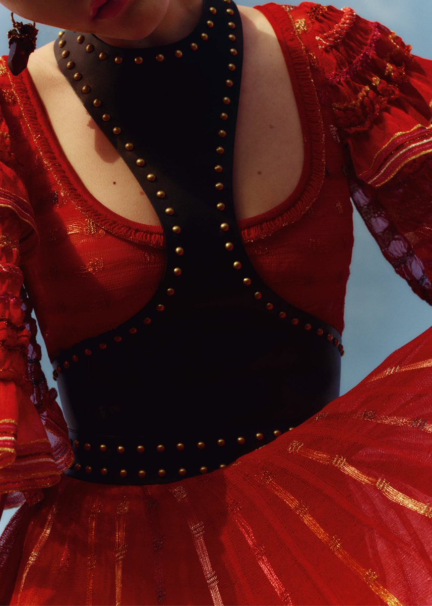 - A crimson fine-knit, ruffled and pleated dress is shot through with metallic thread and worn with a black Art Nouveau harness edged with antique gold studs. From the Alexander McQueen Autumn/Winter 2018 pre-collection. Explore #McQueenPreAW18: http://bit.ly/preaw18mcqueen