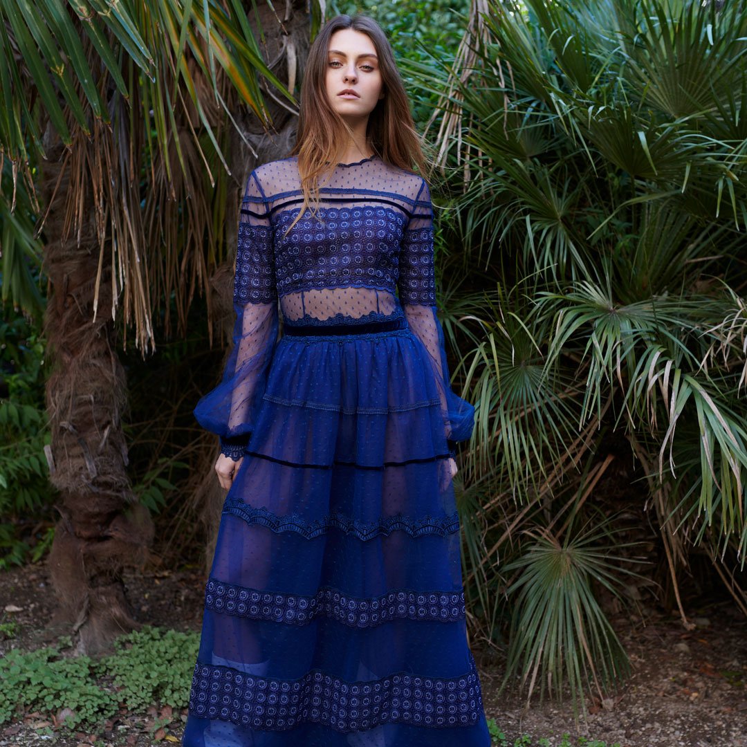 - #NatashaPoly in a deep blue #AtelierVersace look with full tulle skirt, exposed corset bodysuit, and linear celestial embellishment detail at the #amfAR Gala during the 71st International #CannesFilmFestival. #Cannes71