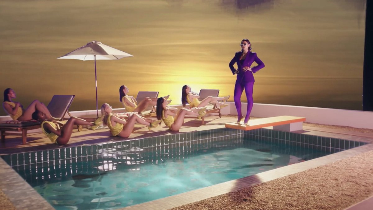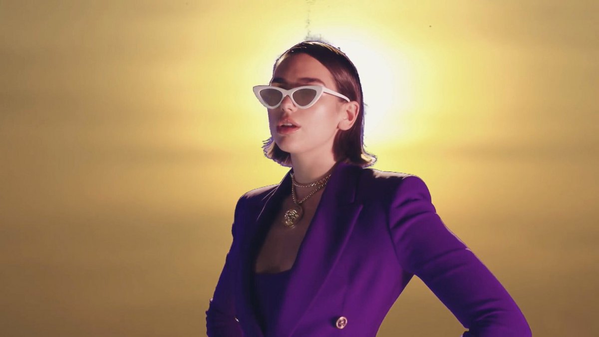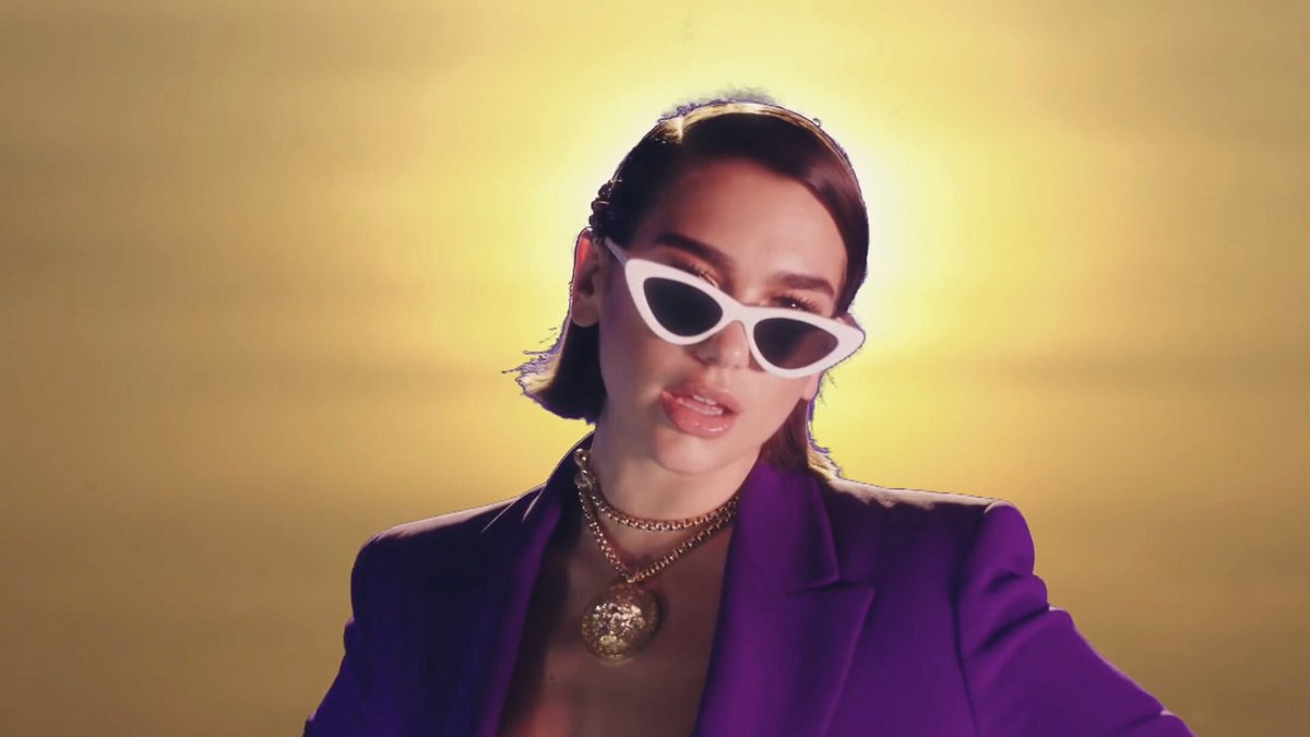 - #DuaLipa wore a bright purple full look combined with a large Versace Medusa gold chain from the #VersaceTribute collection in her latest video of her song "One Kiss" with Calvin Harris. http://Versace.com