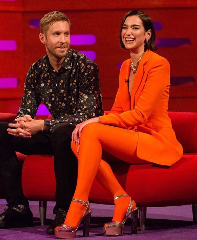 - Dua Lipa wearing a #VersaceTribute orange total look on “The Graham Norton Show” with DJ Calvin Harris. http://Versace.com