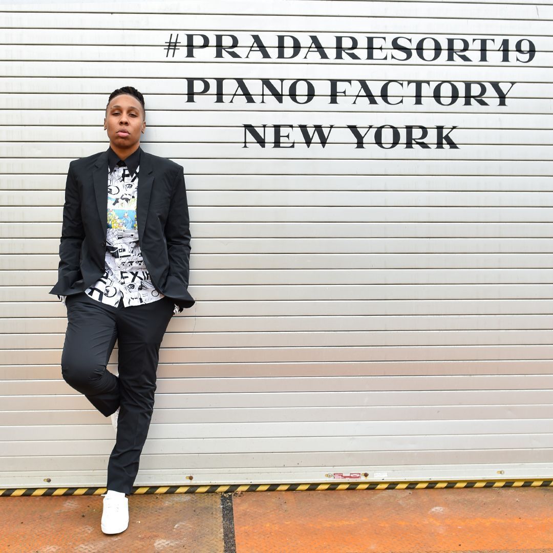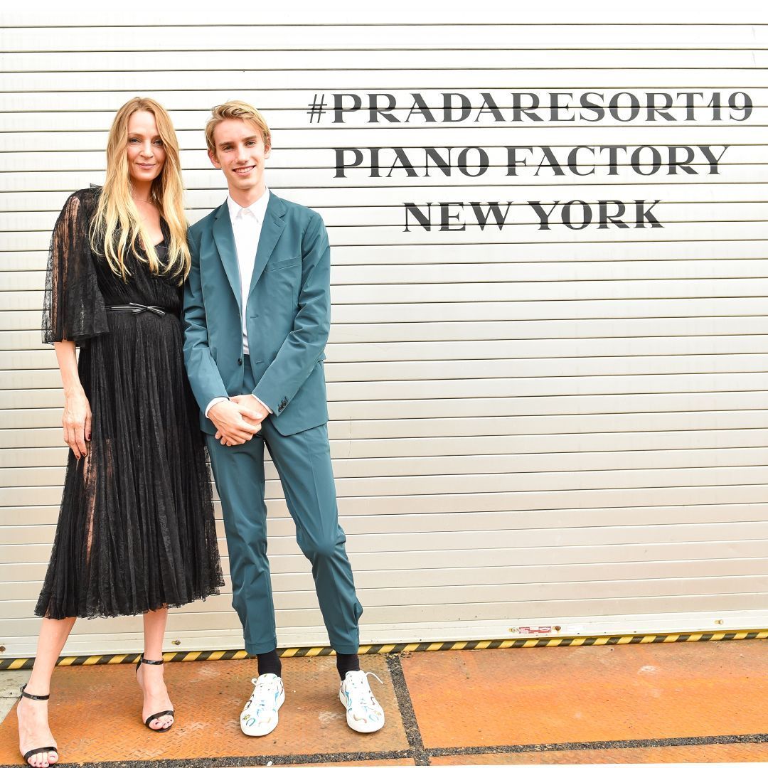 - .@AnselElgort, .@ViolettaK, .@UmaThurman and her son Levon, .@DaneDeHaan, .@annawoodyall and .@LenaWaithe at the #PradaResort19 fashion show at Prada Piano Factory in New York. #PradaPeople