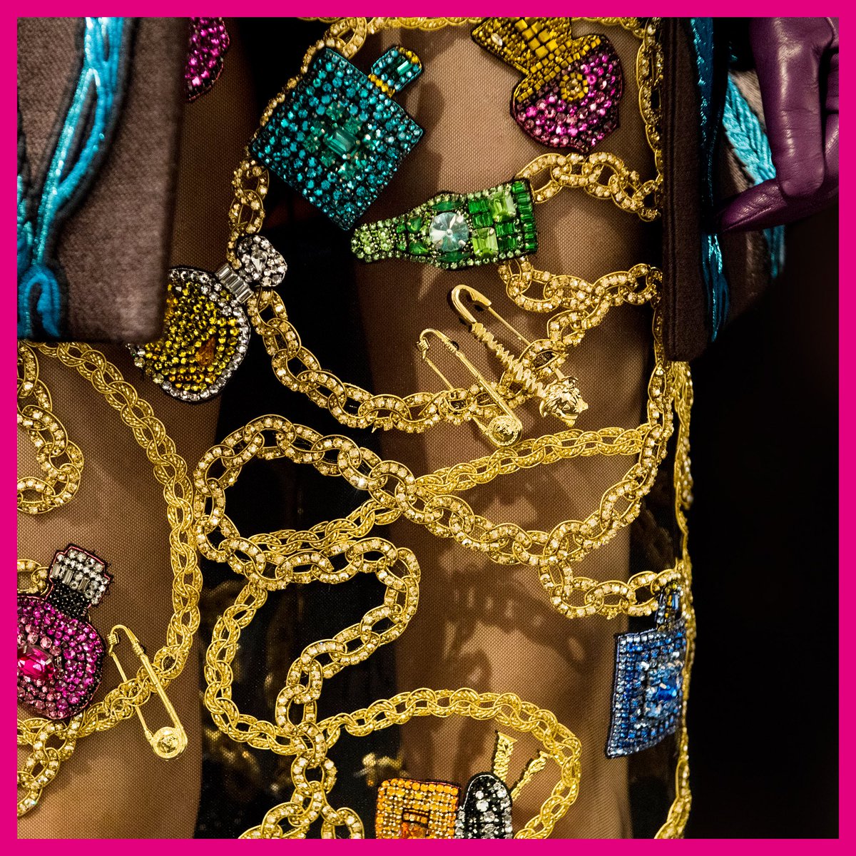 - In the details: crystal beaded chains, perfume bottles and Safety Pins on a transparent tulle skirt. #VersaceFW19 #MFW Watch the show: http://e-versace.com/versacefw19