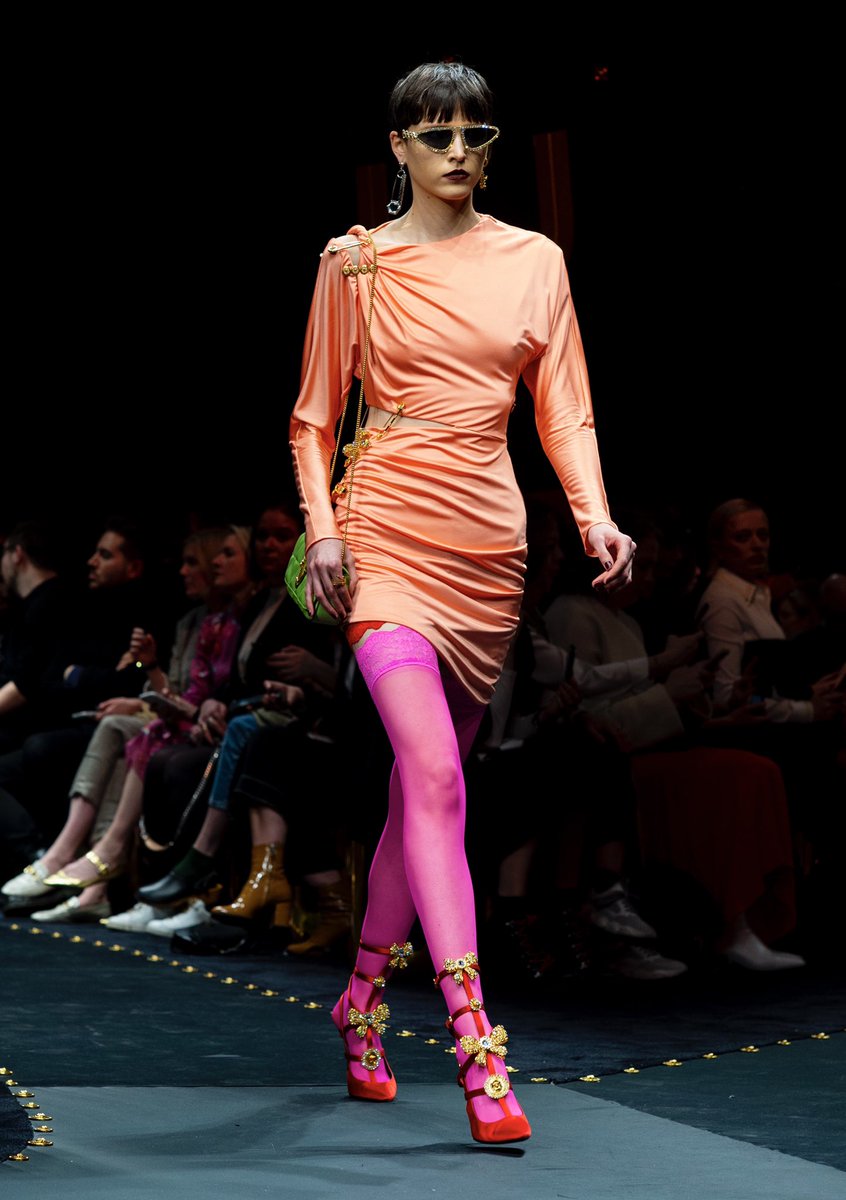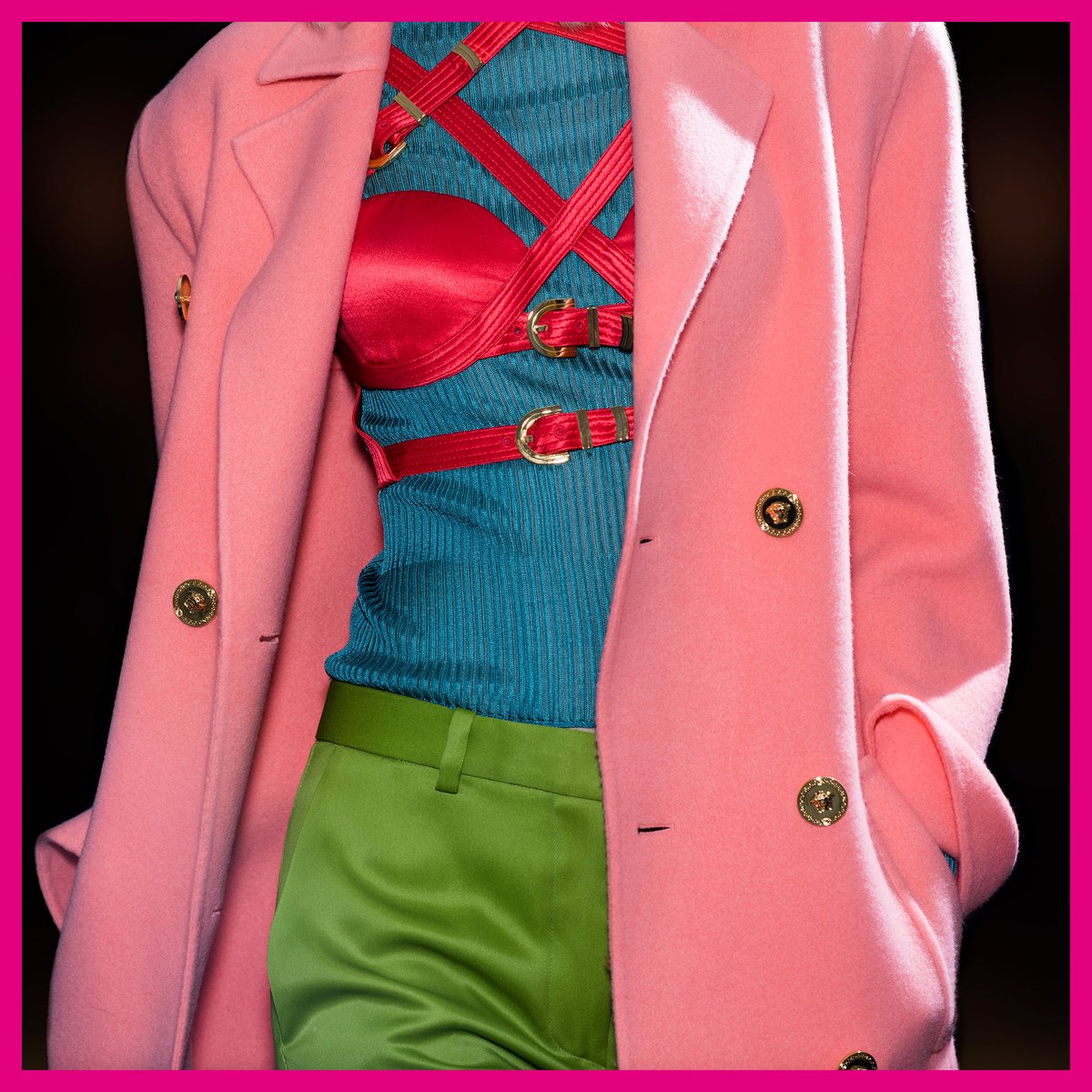 - Vivid tones of color clash and contrast. Knits are overlaid with top-stitched silk bondage straps. #VersaceFW19 #MFW Watch the show: http://e-versace.com/versacefw19