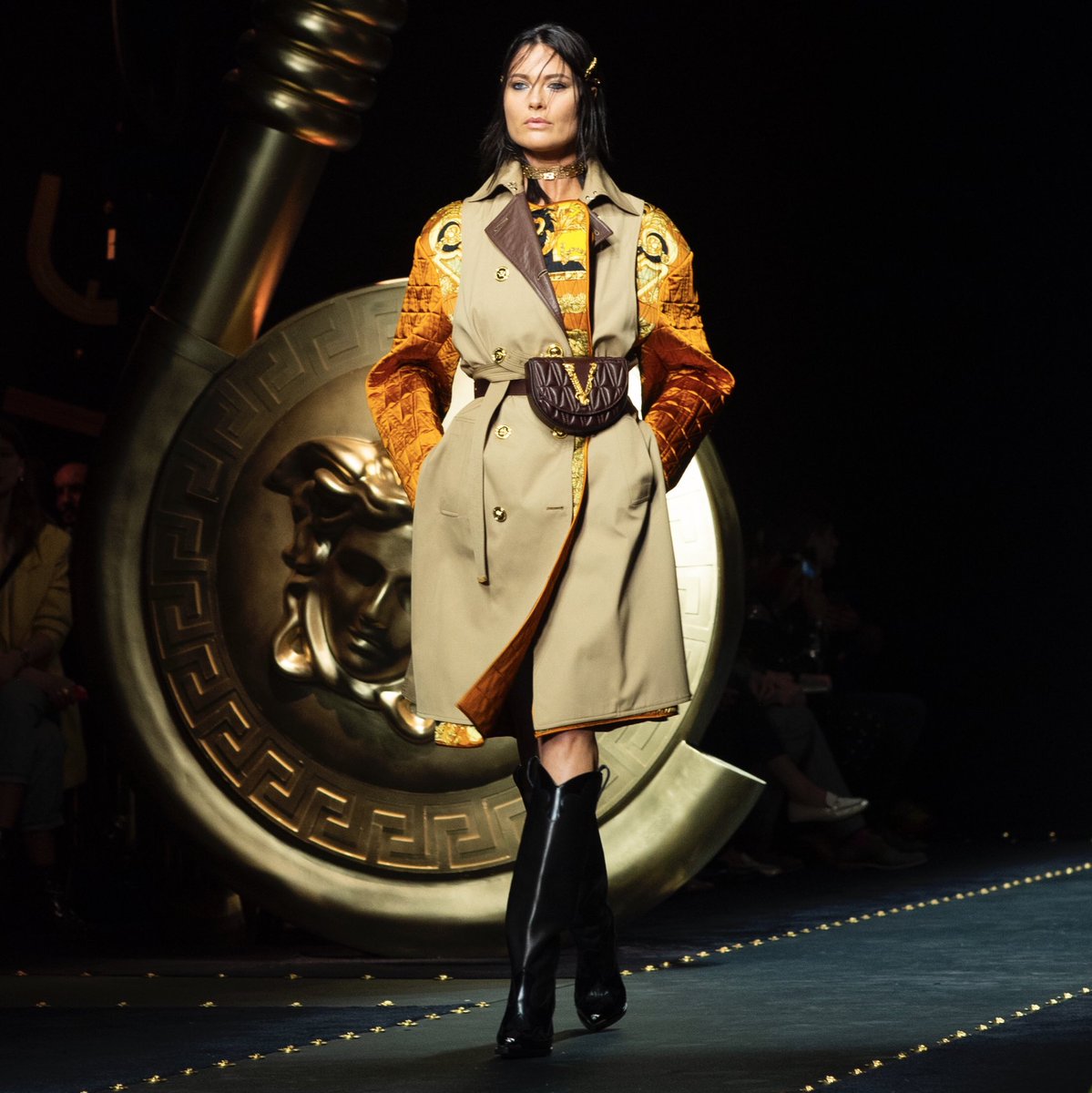 - Shalom Harlow opens the #VersaceFW19 runway show wearing a trench coat with Barocco print accents, a Virtus belt bag and knee high V-Western boots. #MFW Watch the show: http://e-versace.com/versacefw19