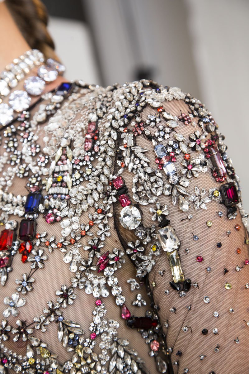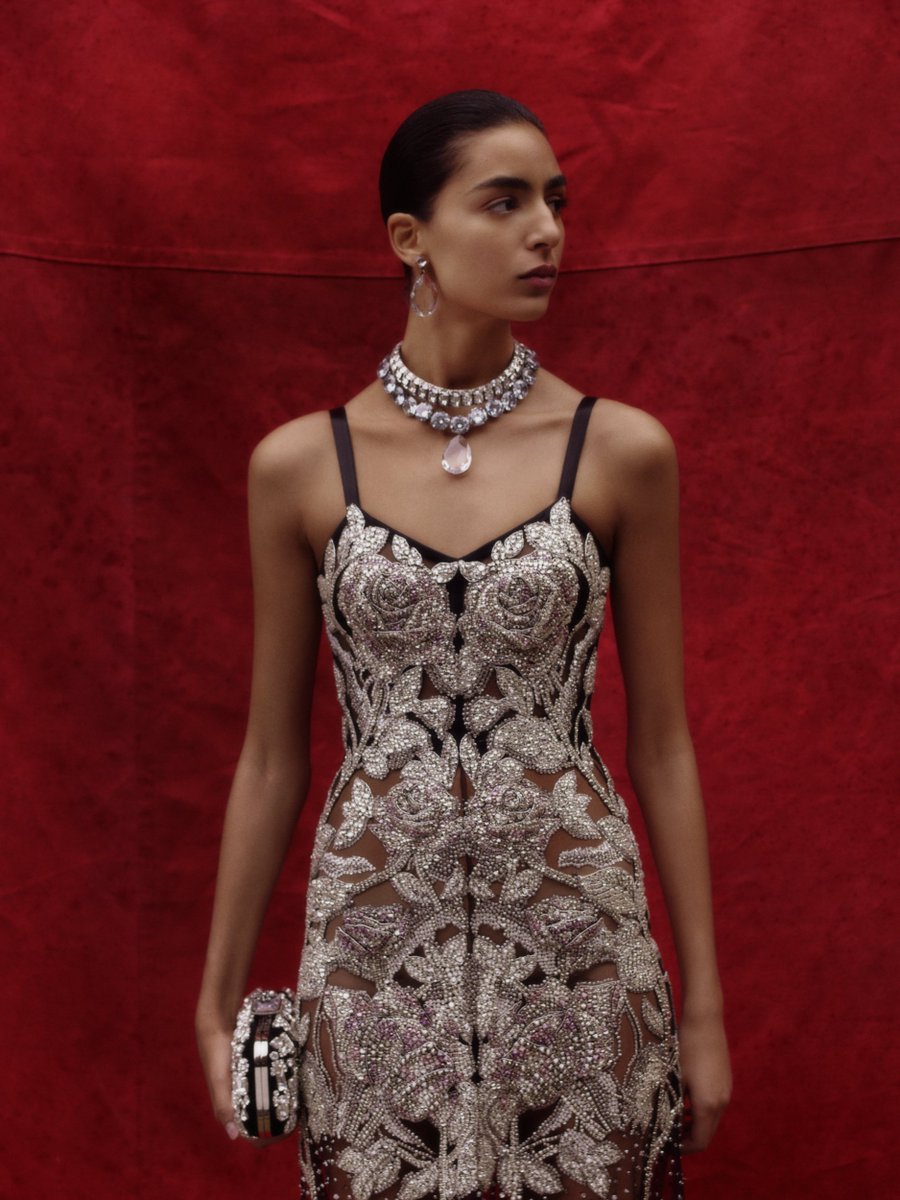 - A hand-embroidered multi-coloured crystal chandelier dress worn with a round riviera jewelled crystal choker. From the Autumn/Winter 2019 pre-collection: http://bit.ly/mcqueen_preaw19 #McQueenPreAW19 #AlexanderMcQueen
